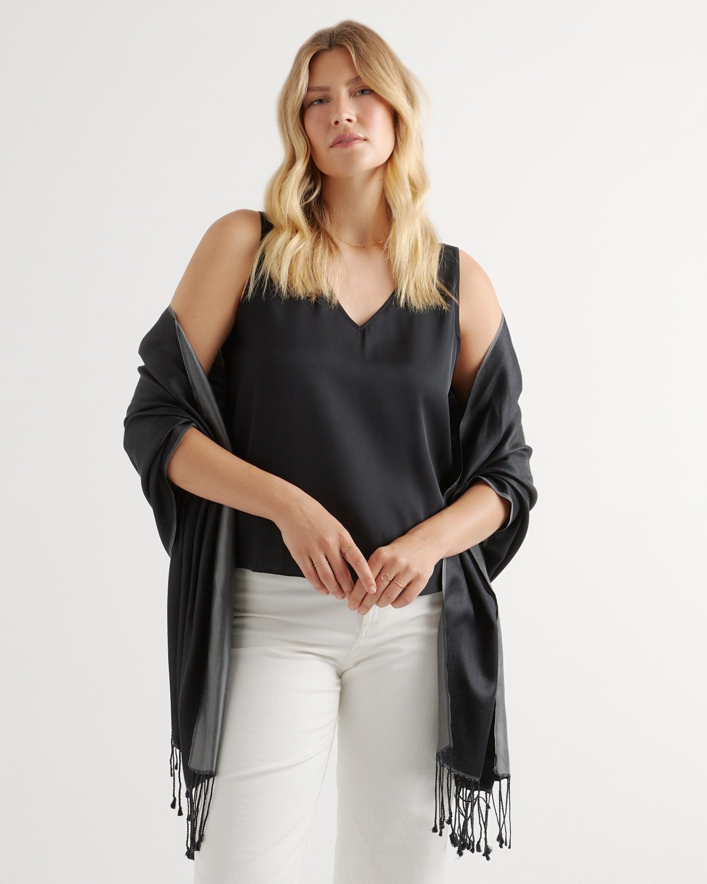 Wedding season better watch out. This 100% silk, reversible scarf features different colors on either side, making it a super versatile piece for any occasion. Fend off the post-sunset chill and keep your glow, with a lightweight layer with light shine.