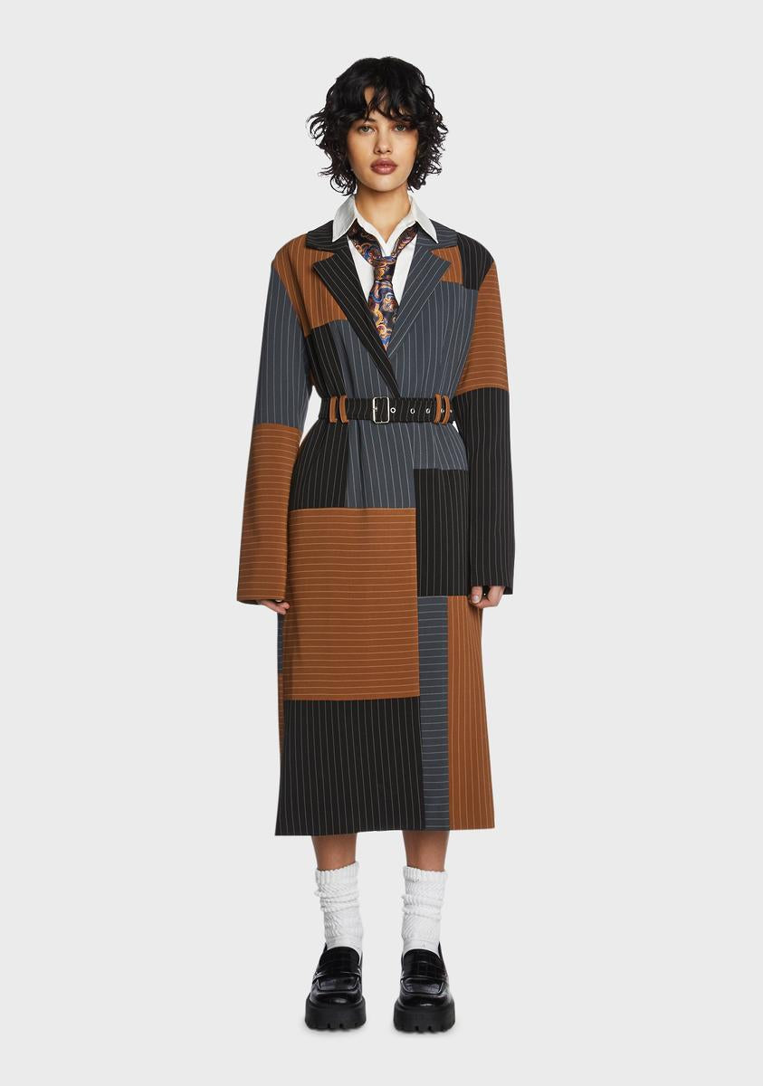 cuz you're too good for 'em! This midi-length coat has a patchwork striped print all over, a non-stretch cotton construction, notched lapels, an adjustable buckled belt, side pockets, and long sleeves.