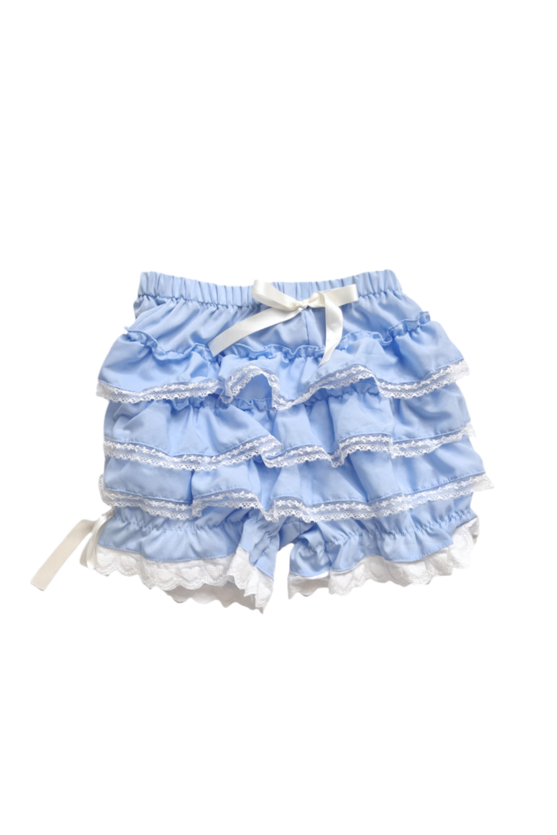 Lacy fluffy bloomers in a dusty blue with white lace trim.