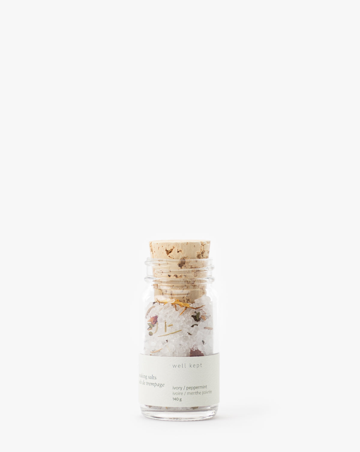 Kept in a simple glass bottle with a cork stopper, the Aromatherapy Bath Salts are made with natural ingredients. Intended to calm and soothe, the bath salts include epsom salts, peppermint, marigold, rosemary, rosehip, rose petals, and peppermint essential oil. Ease into self care by sprinkling the salts into your bath, swirling them around in the water until dissolved.