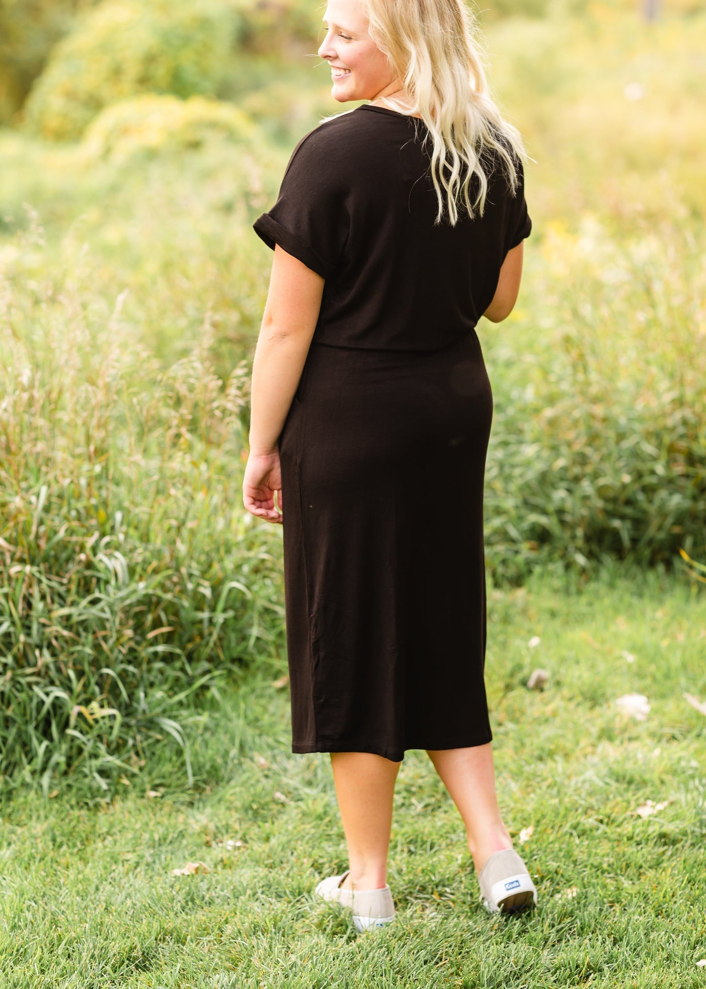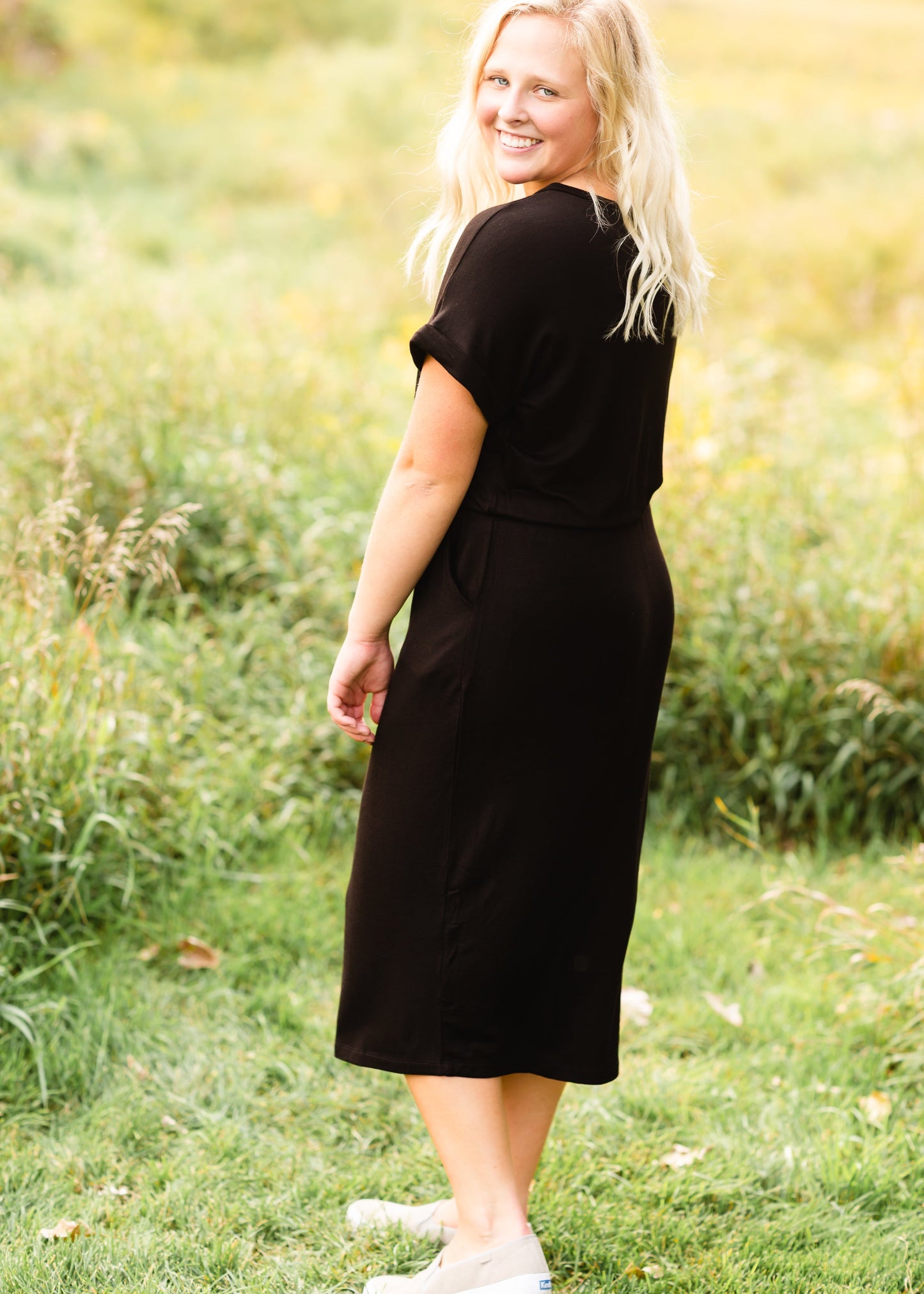 A simple Black Tie Waist Midi Dress has such a subtle way of looking and feeling so put together. This versatile, black midi dress pairs with flip flops and sunglasses for the beach and?boots and a cardigan?for an afternoon?at the pumpkin?patch. This soft stretch, black midi dress ties at the waist, giving you versatility in how you wear this easy-going dress! Oh, and of course pockets!