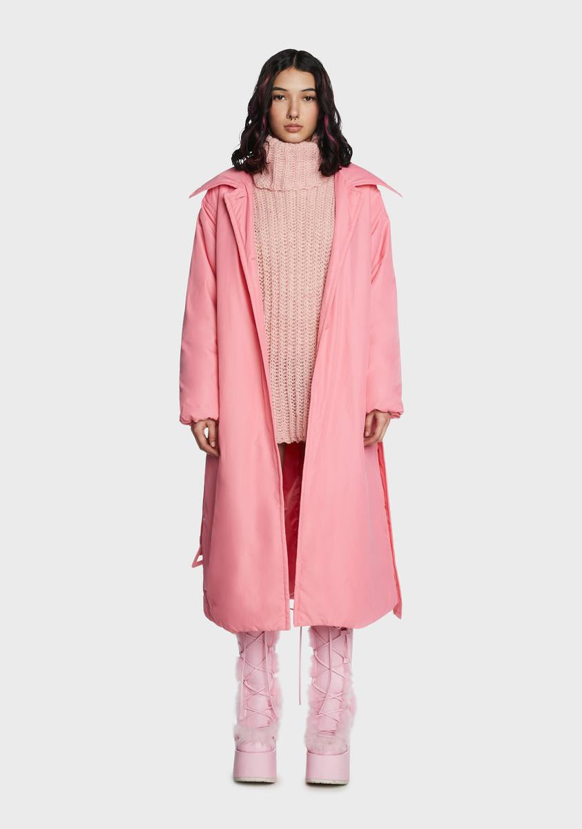 cuz feeling flirty! This trench coat has a puffy construction, long sleeves with elastic cuffs, a notched lapel collar, a front button closure, and a tie belt closure.