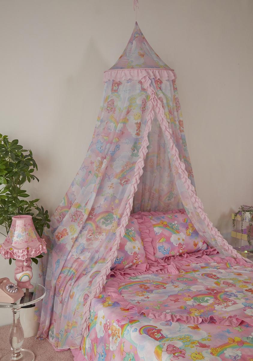 for bringin' color to the dreariest of days! This bed canopy has a sheer mesh construction, ruffle trim, and comes with built-in hardware, rope, and other accessories for installation.