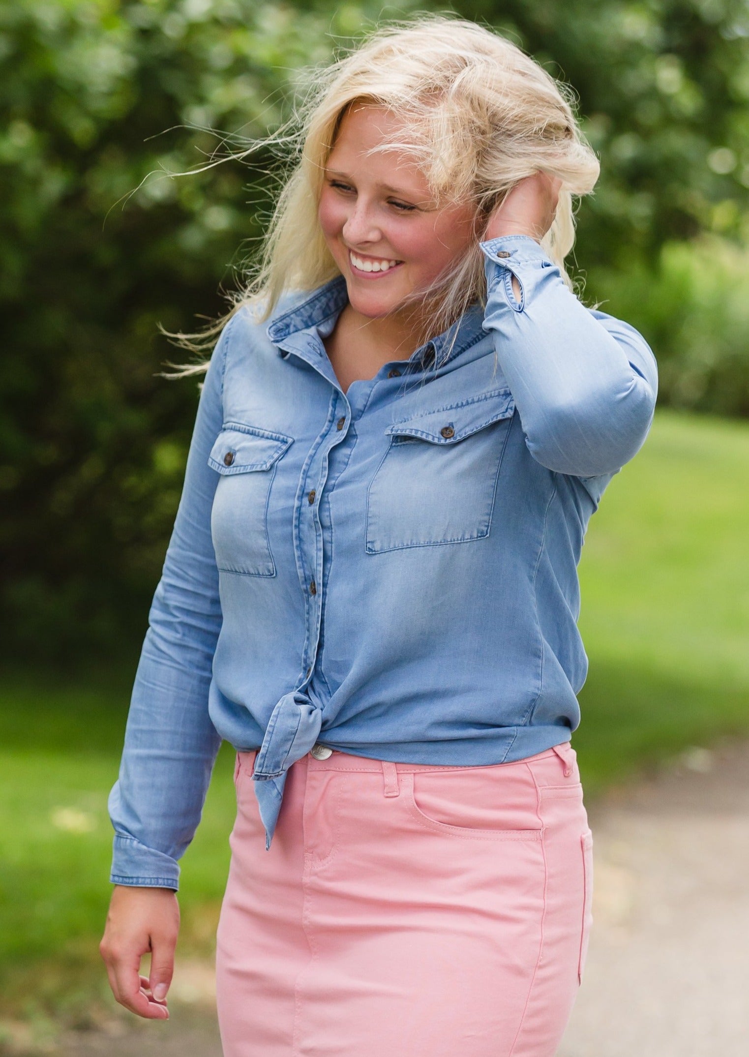 Who doesn't love a chambray shirt?!?The Button Up Denim Chambray Top is the?sweetest, light wash style. It has? buttons down the front, and the option to tie an adorable knot in the front or wear it open and long as-is! So easy to pair with anything and create a effortless style for?any day of the week!?