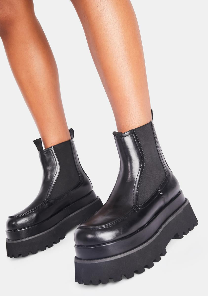cuz you go against the grain. These chelsea boots have a shiny vegan leather construction, elastic side gussets for an easy pull-on fit, and stacked platform soles.