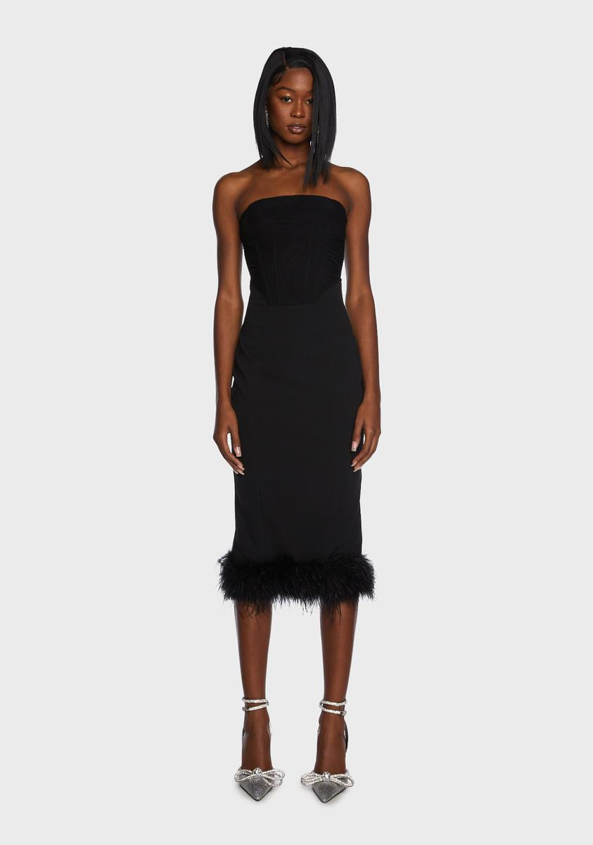 cuz you're giving lessons. This dress comes with a corset style top, a strapless fit, feather trim hem, and a back zip closure.