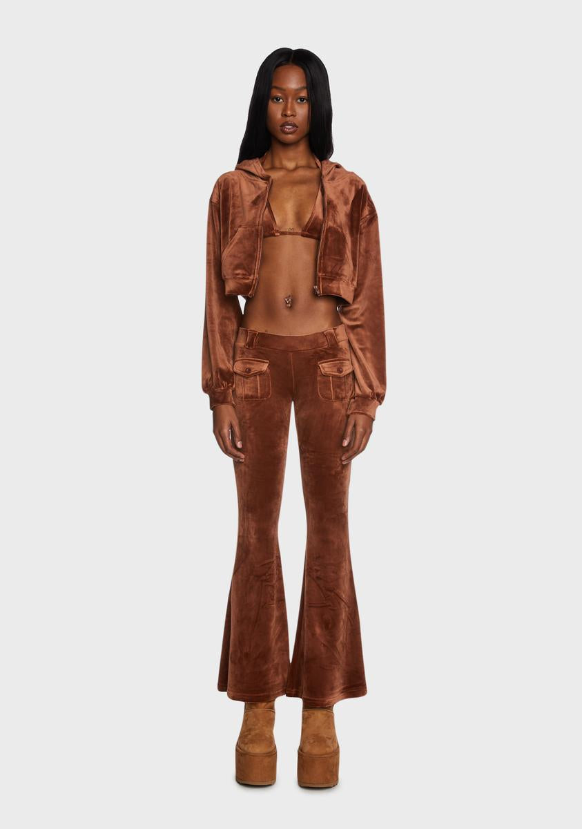 cuz you're a y2k queen! This 3-piece velour tracksuit set has a zip-up closure, cargo pockets, belt loop details, and a low rise fit. Includes a triangle bra top, crop hoodie, and matching flare pants.