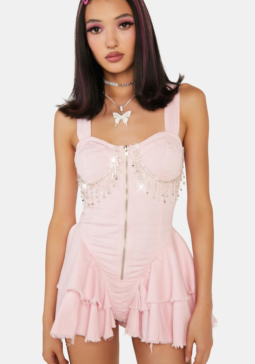 cuz you're looking for more than fun. This sleeveless playsuit has a twill construction with little stretch, rhinestone fringe hanging from the bust cups, voluminous ruffles at sides with frayed hems, a front exposed zipper, wide fixed shoulder strap