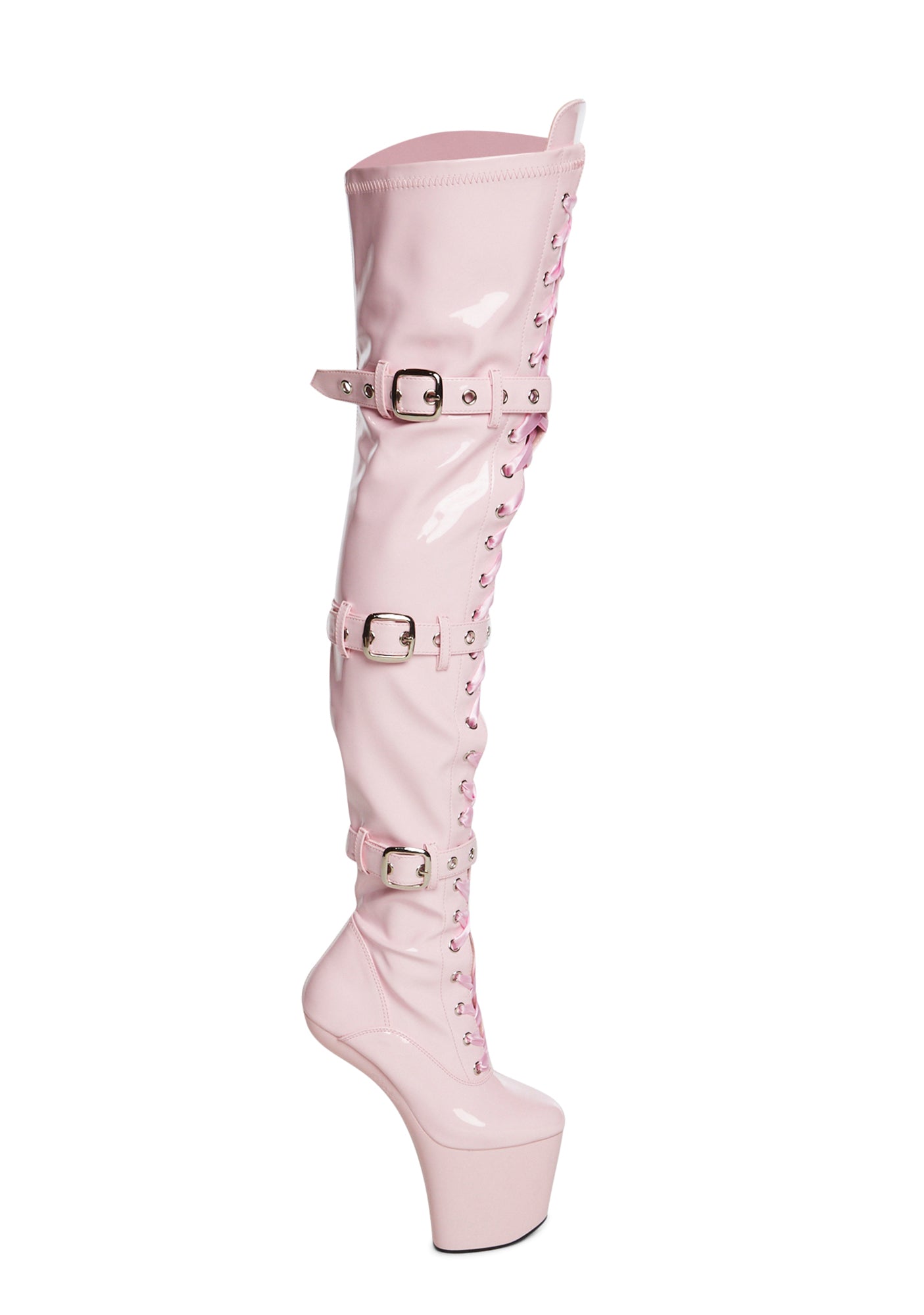 take it to the next level. These heelless platform boots have a patent vegan leather construction, adjustable laces, buckle straps, side zipper closures, and are convertible to wedge boots with included heel attachments. **WARNING: due to extreme hei