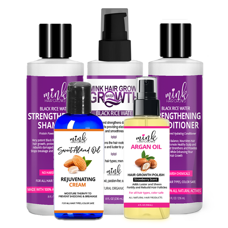 Includes: (1) Black Rice Water, (1) Black Rice Water Shampoo, (1) Black Rick Water Conditioner, (1) Argan Oil, (1) Rejuvenating Cream