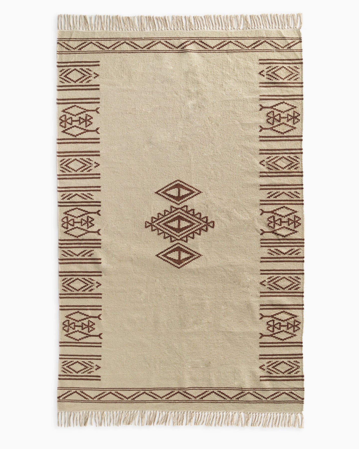 The Remi Wool Kilim Rug features a global inspired geometric design and is offered in both a brown and natural palette.