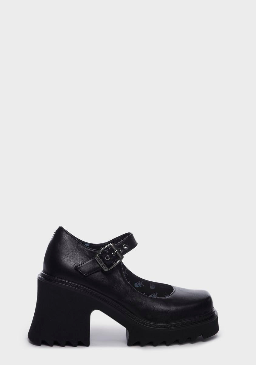 cuz it's time to make yourself known. These platform Mary Janes have a vegan leather construction, adjustable buckled straps, low block heels, ridged outsoles, and a skull-printed interior.