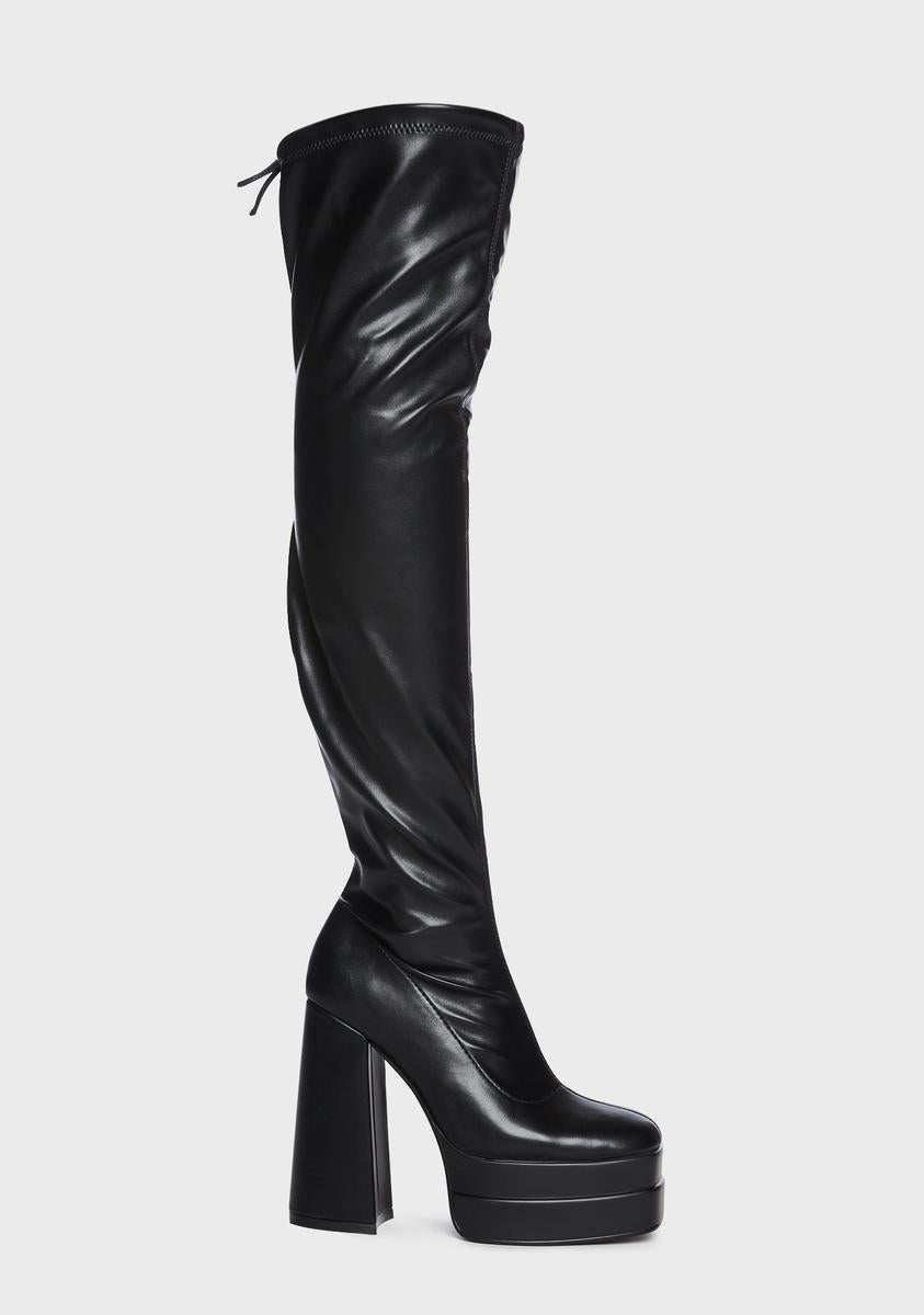 for goin' full-speed ahead! These thigh-high boots have a vegan leather construction, double-stacked platforms, adjustable cuff ties, side zip closures, and block heels.