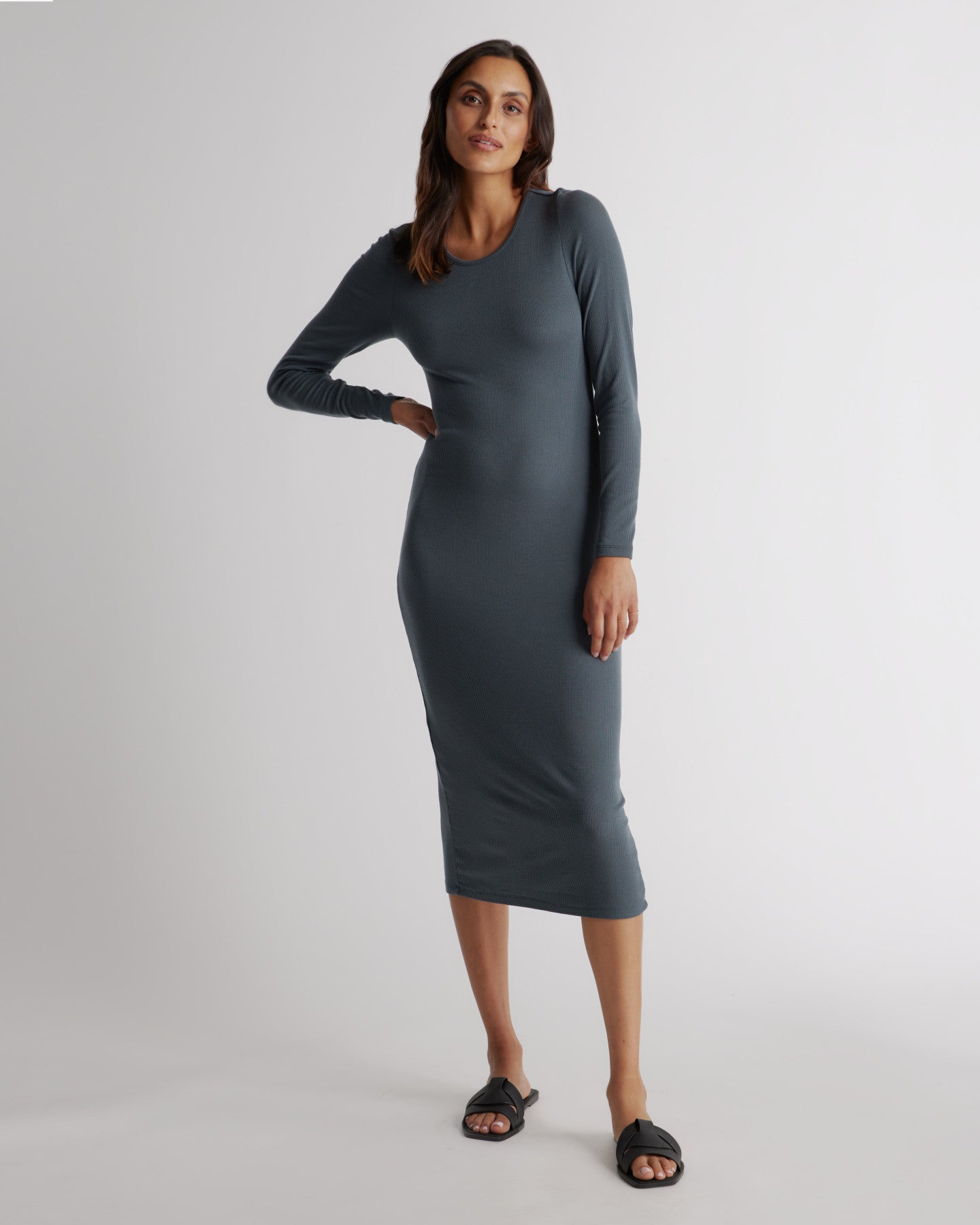 We've added long sleeves to our favorite rib knit dress. With a classic scoop neckline and midi-length, this rib knit dress will take you from day to night. So comfy and versatile, with a lot of stretch for the perfect fit. Tencel�?lyocell is a biodegradable fabric made from cellulose found in wood pulp. It is softer, more breathable, and uses 10-20 times less water in production compared to cotton.