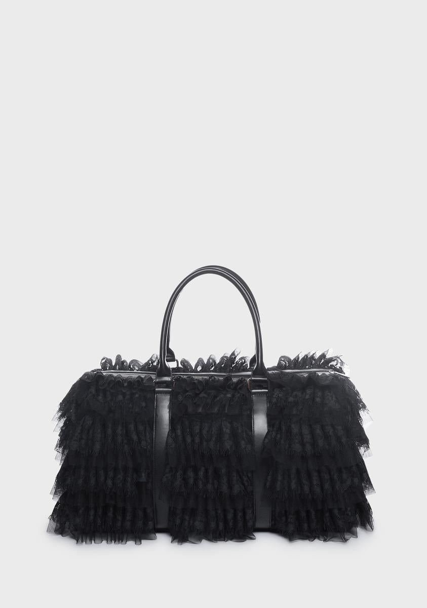 for givin' the gift of absence. This weekender bag has a tiered ruffled lace and vegan leather construction, top handles, a top zip closure, bow-printed lining, interior patch and zip pockets, and comes with a detachable adjustable shoulder strap.