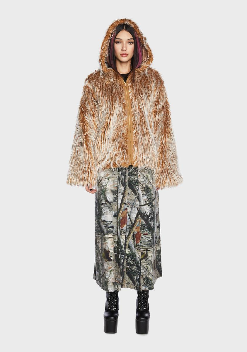 got you a whole new aesthetic! This long sleeve jacket has a shaggy faux fur construction, an oversized fit, a fixed hood, a front zip closure, and side pockets.