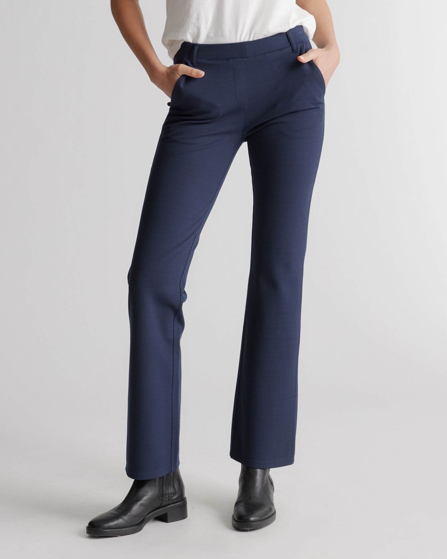 We heard your feedback and added pockets to our favorite ponte pant. Yes, it is the exact same pant, but with functional pockets. If dress pants and yoga pants had a kid - this would be it. The stretchy knit makes these bootcut pants equally appropriate for work or the couch.
