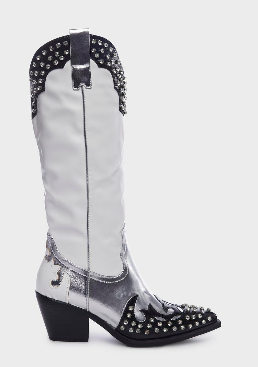 will make you shine! These cowboy boots have a colorblocked metallic vegan leather construction, pull loops, and sparkly rhinestones at the cuffs, pointed toes, and block heels.
