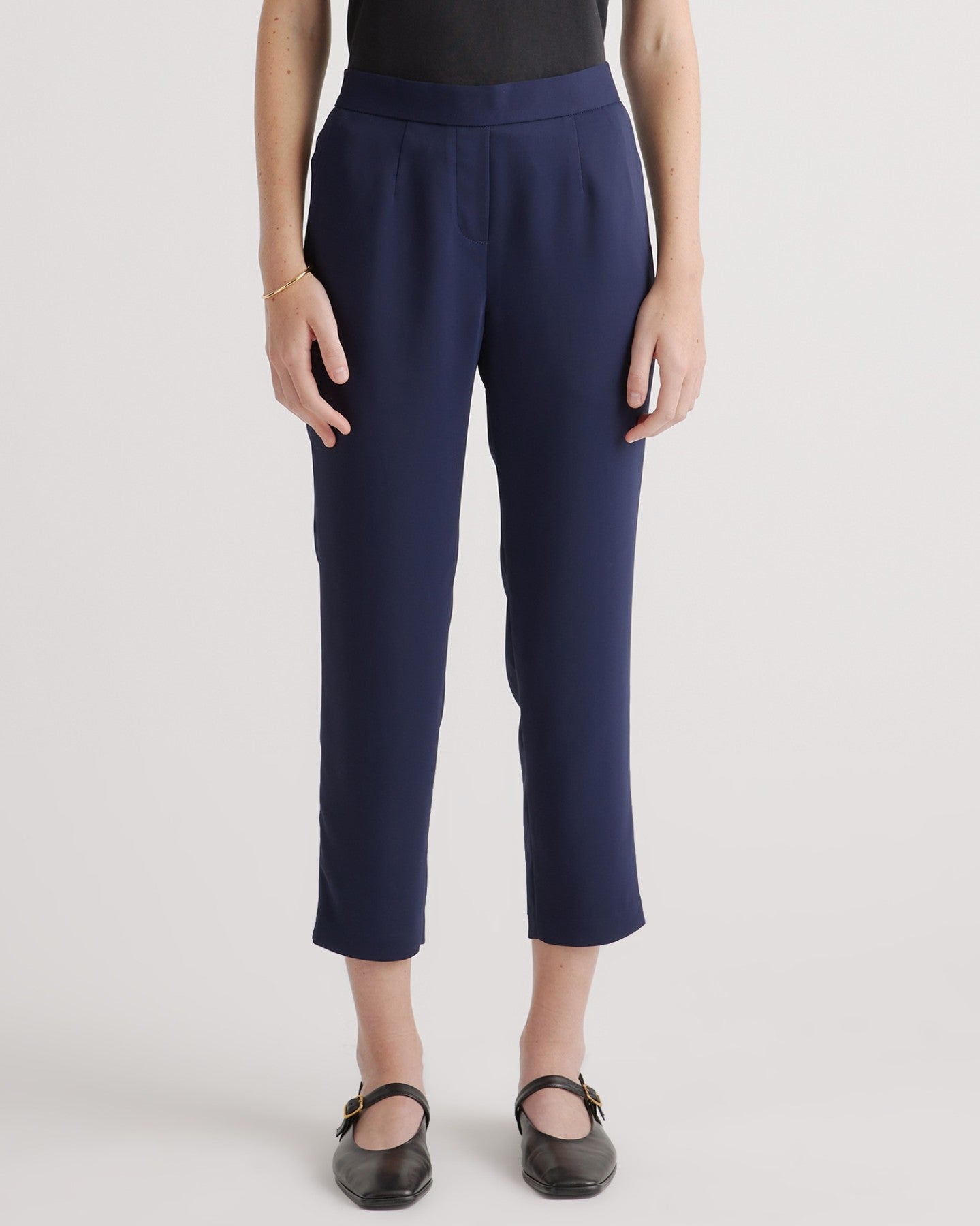 We call these ready-to-wear on repeat. Our Stretch Crepe Pleated Ankle Pant is both tailored and laidback with front darts and slim, cropped legs for a relaxed yet fitted look. The recycled poly-spandex blend and elastic waist keep them all-day comfy, too. Dress them up with a blazer or keep them weekend casual with your favorite cashmere sweater.