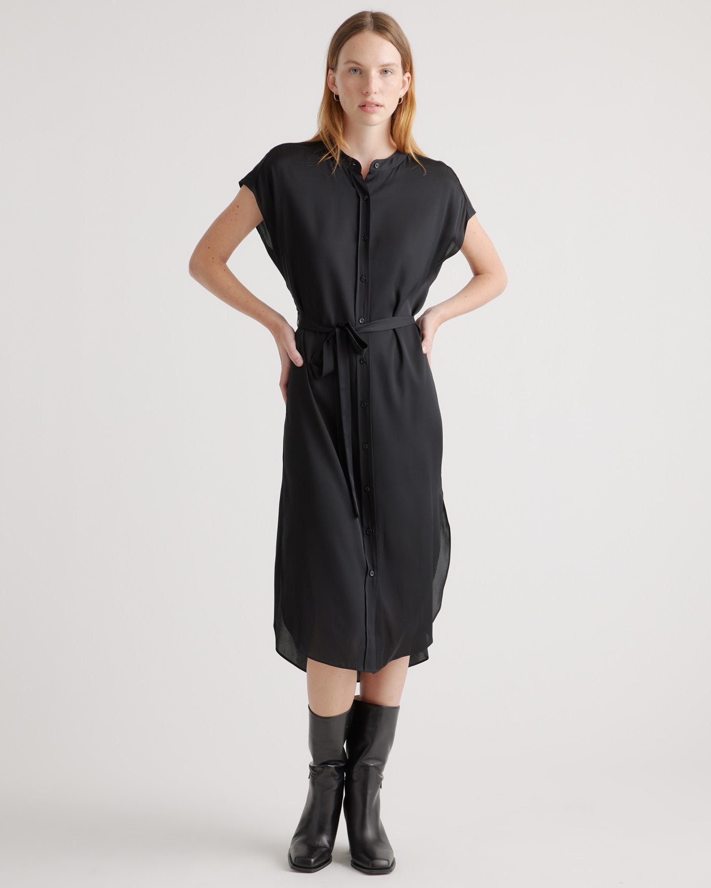 The ultimate day-to-night dress, our Washable Stretch Silk Midi Shirt Dress is crafted from best-in-class mulberry silk with a hint of stretch. We gave the classic shirtdress silhouette a modern update with a band collar, short dolman sleeves, and a rounded hem. Luxuriously soft to the touch with a gorgeous drape and customizable belted waist, this midi-length style is designed to flatter and feel good.